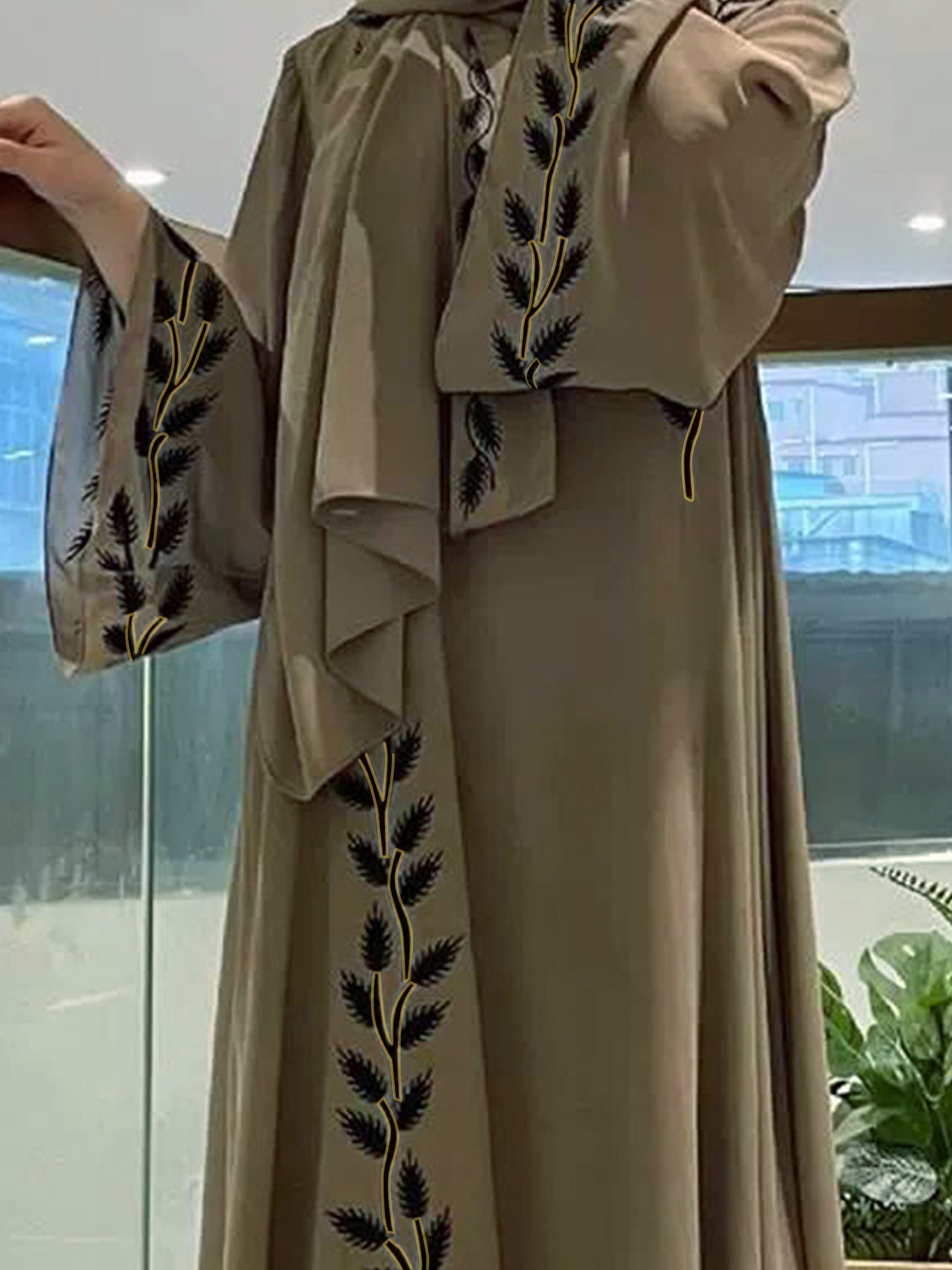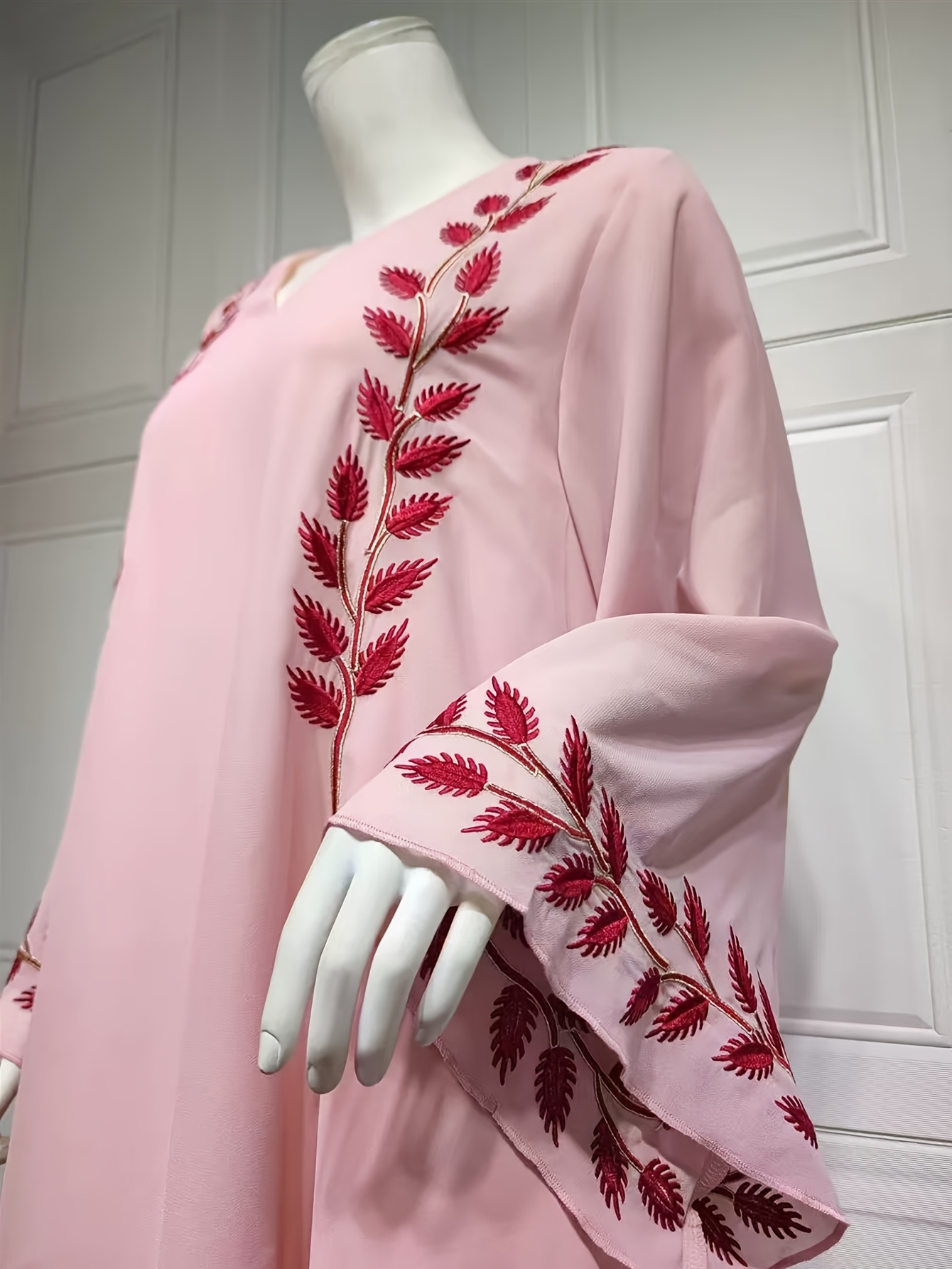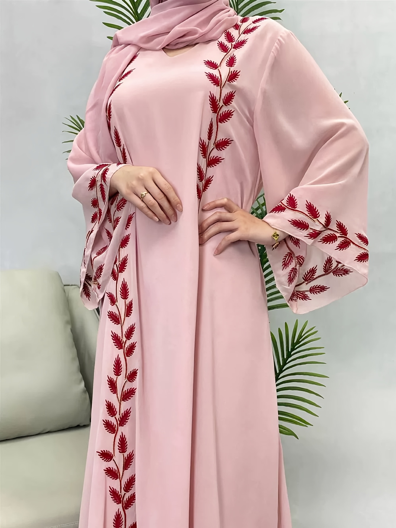 2pcs set of Middle Eastern clothing, fashionable street style, pink round collar embroidered long robe + headscarf