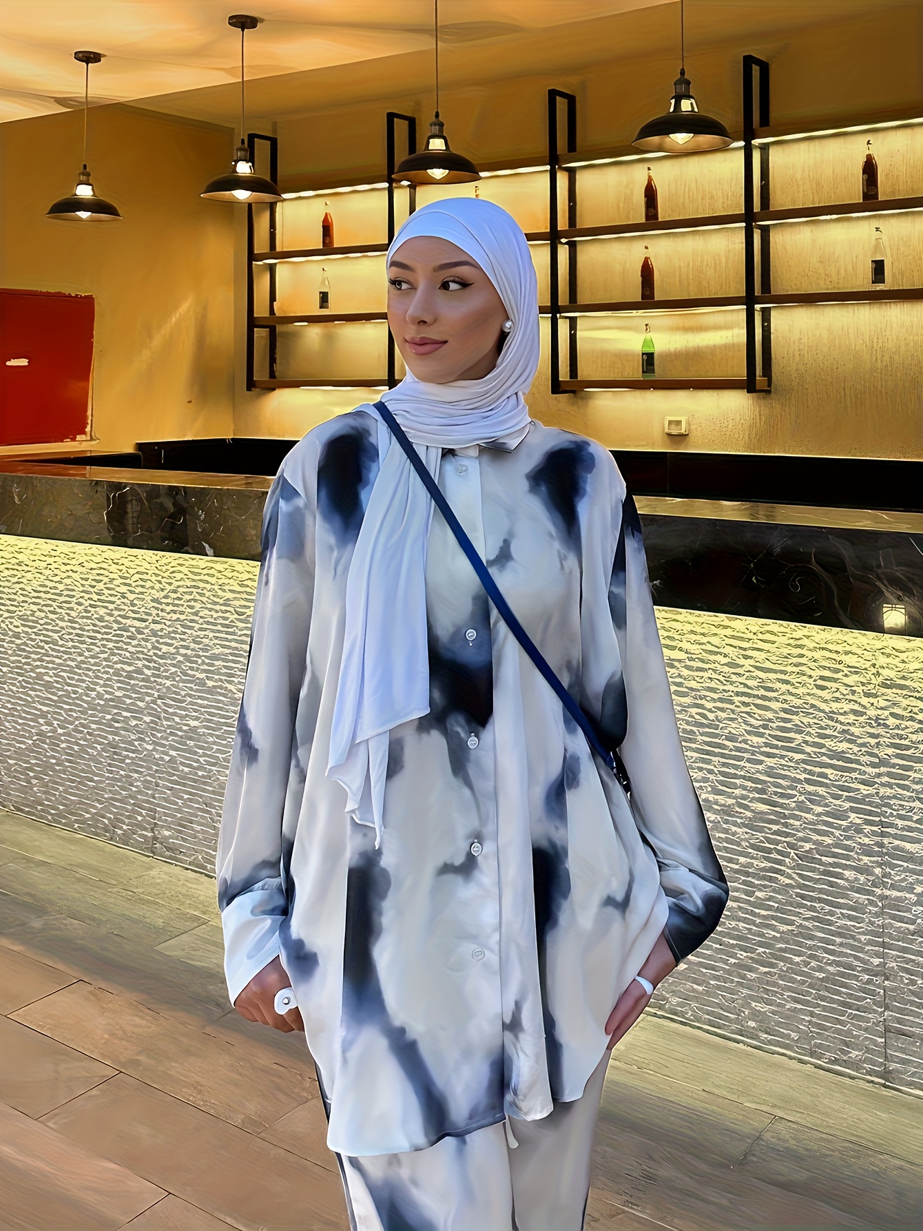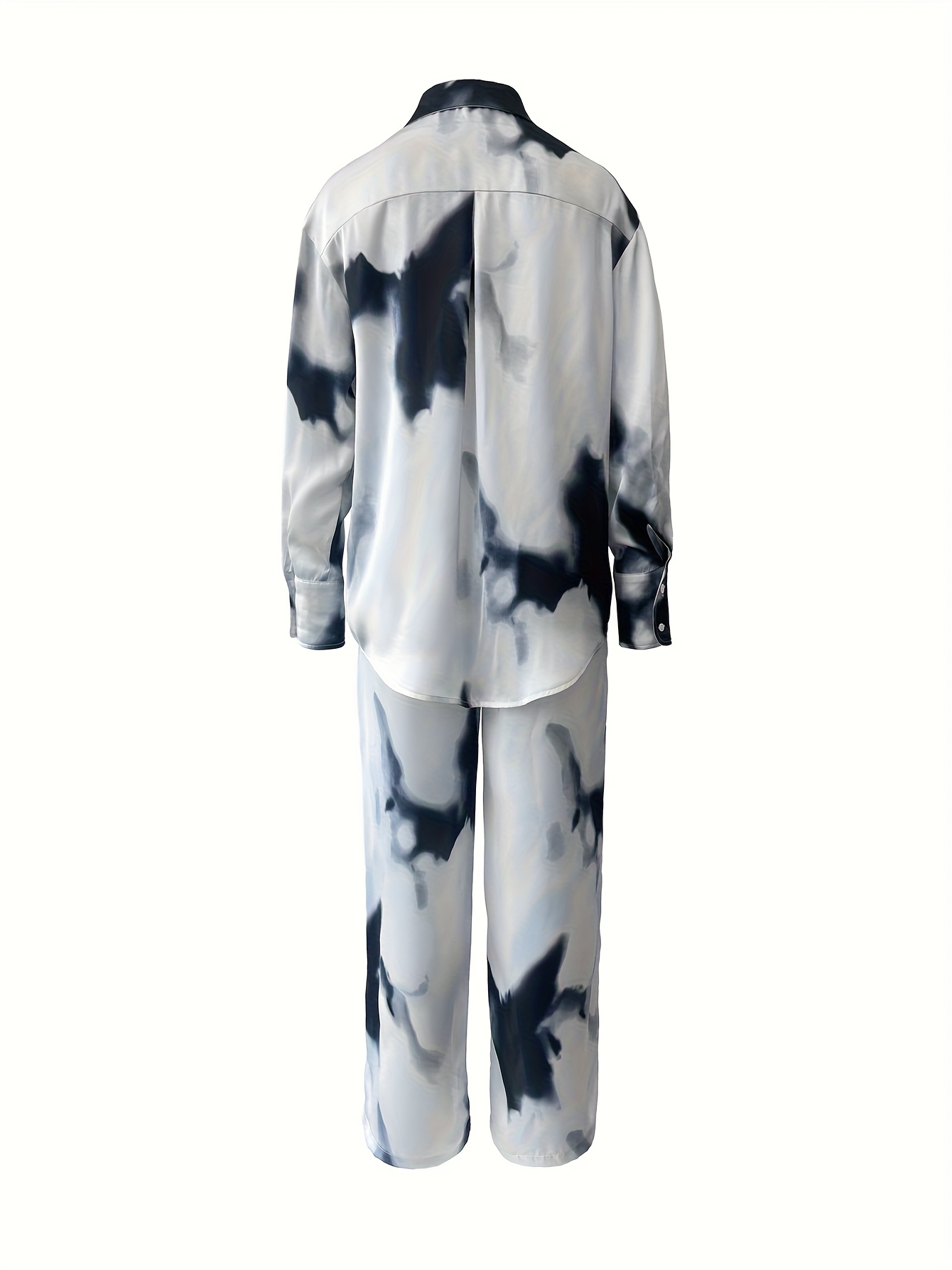 2pcs Women's Elegant Arabic-Inspired Abaya Set - Long Sleeve Shirt & Pants with White & Black Gradient Print, Structured Button-Up Outfit, Machine Washable All-Season Muslim Women's Clothing for Casual & Formal Events, Fancy