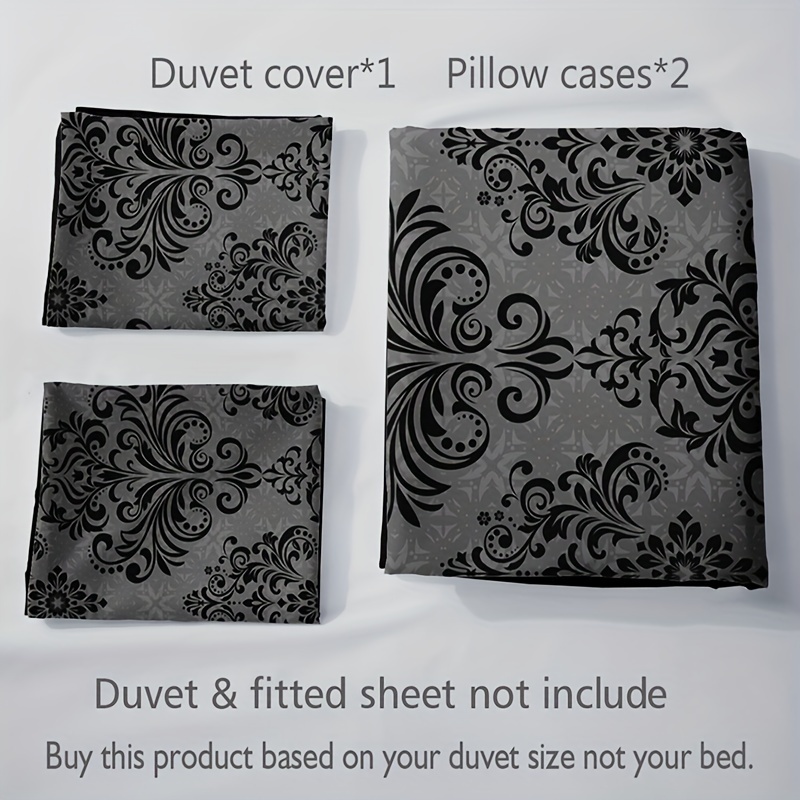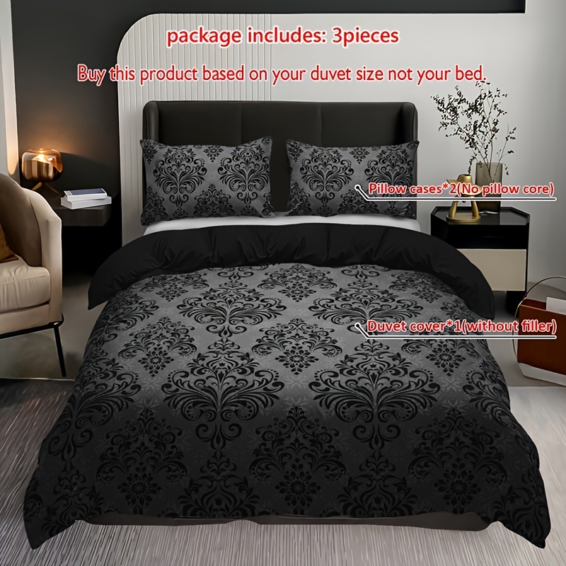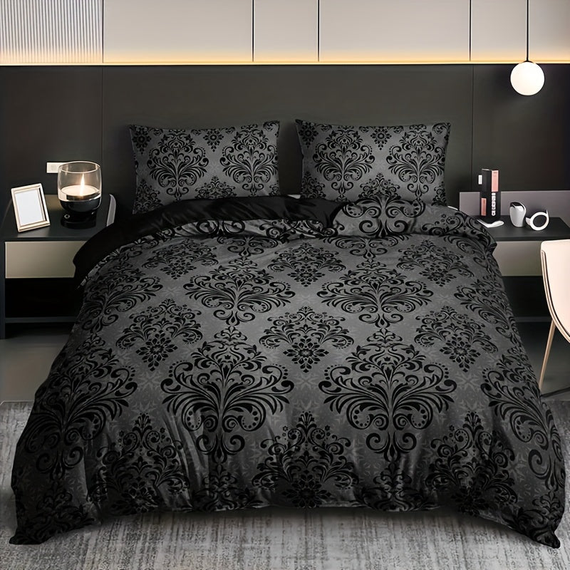 3pcs Black and Gray Floral Pattern Duvet Cover Set - 1 Duvet Cover + 2 Pillowcases, High-Definition Print, Polyester, All-Season Comfort, Machine Washable, Ideal for Home and Dorm Use, Dorm Room Essentials|Floral Pattern Bedd