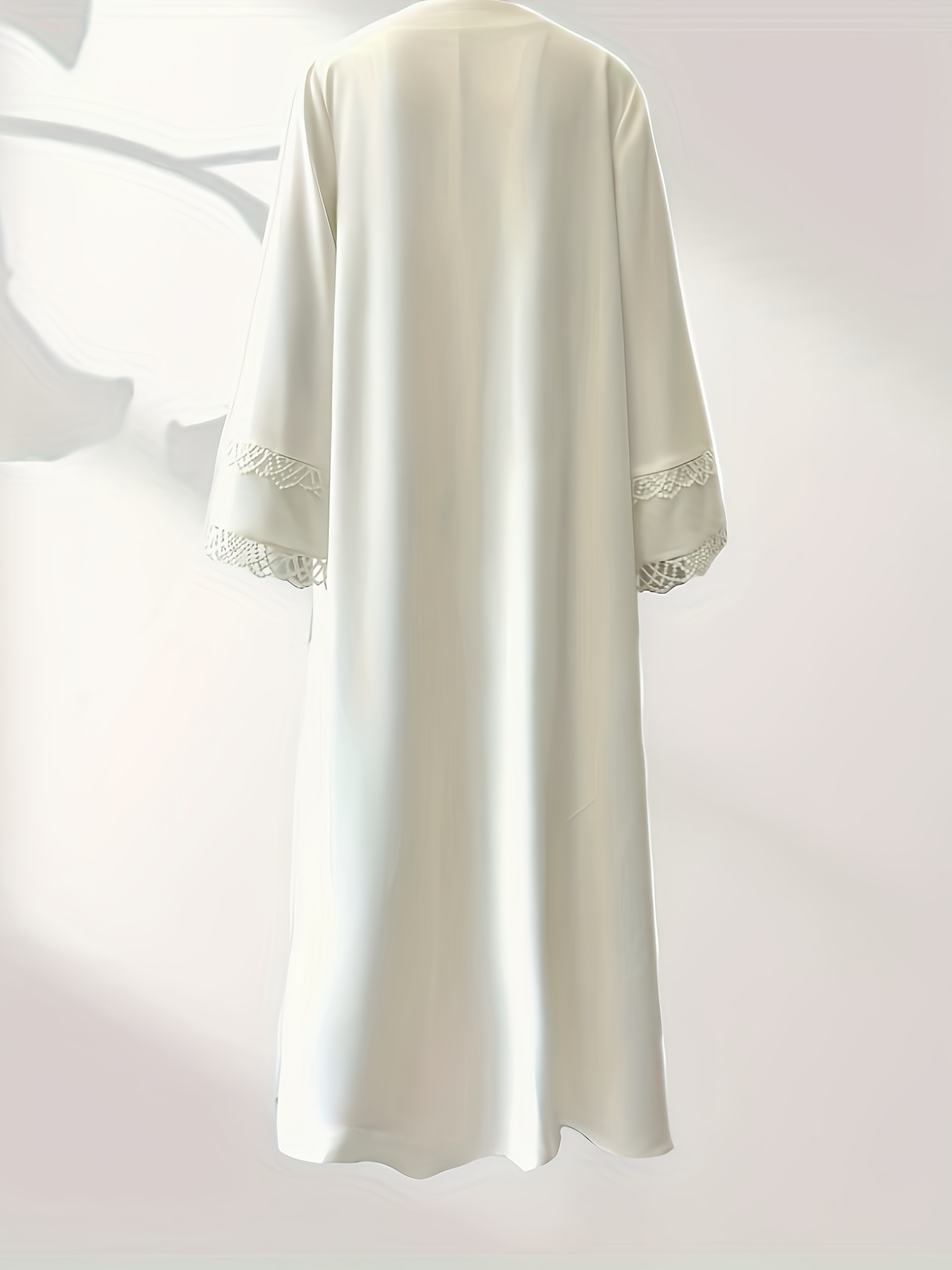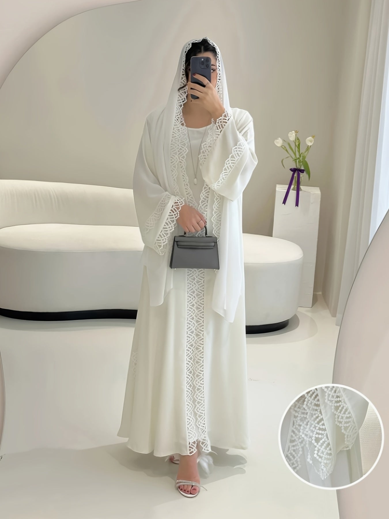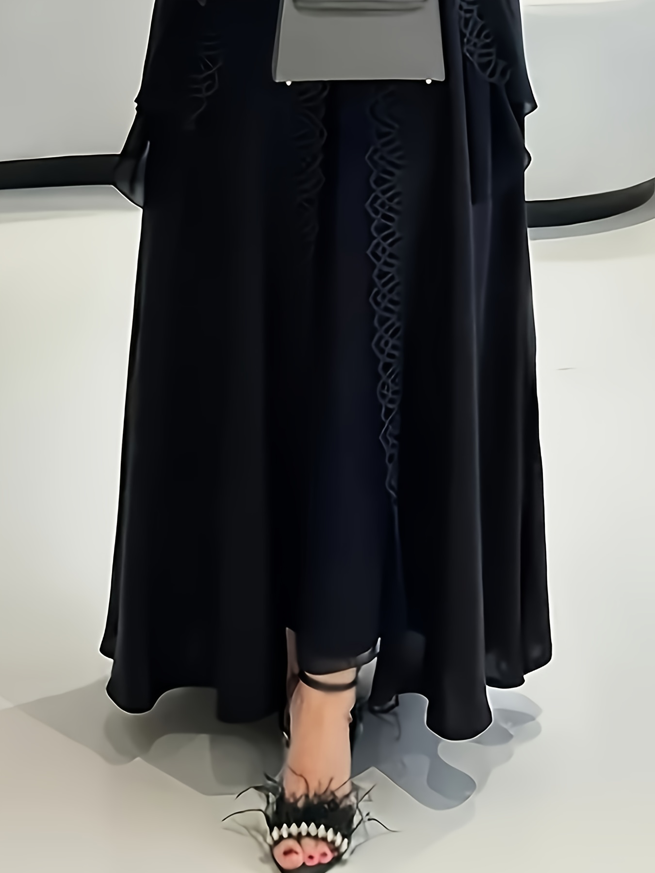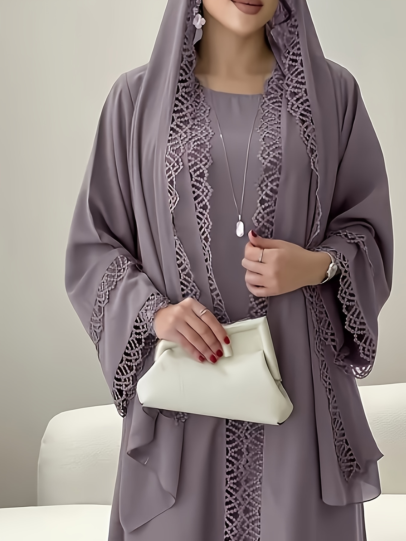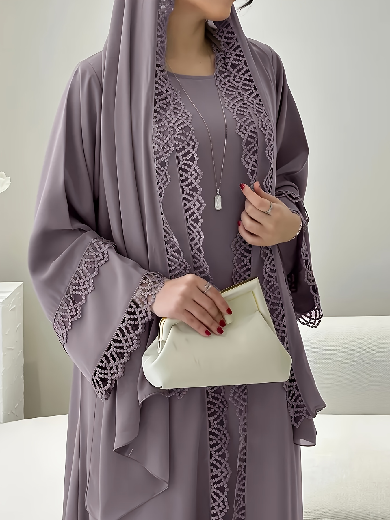 3pcs Elegant Muslim Women'S Abaya Set with Sleeveless Vest Skirt, Headscarf, and Belt - Black Lace Trim, Long Sleeve, Solid Color, All-Season Wear, Modest Fashion for Ramadan, Elegant Attire|Traditional Attire|Lace Trim Detai