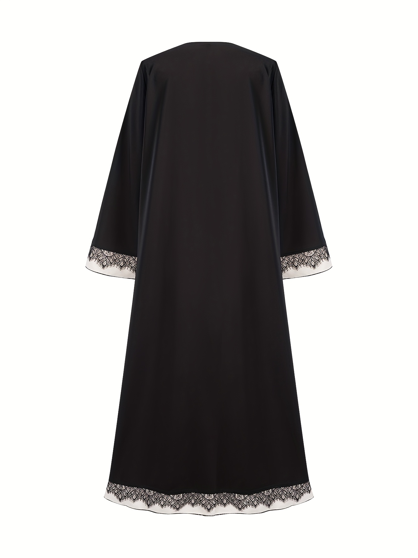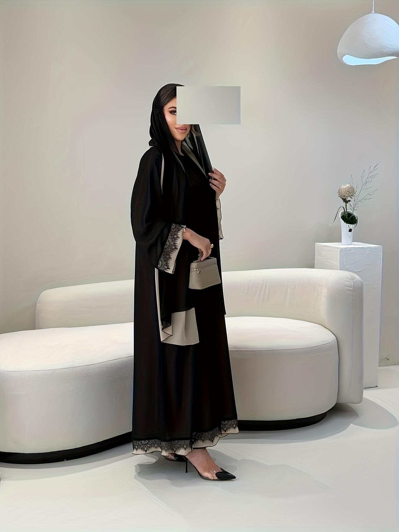 3pcs Middle Eastern Traditional Abaya & Hijab Set - Elegant Long Sleeve Muslim Prayer Robes with Lace Trim, All-Season Wear, Loose Flowing Hem, Solid Black & White