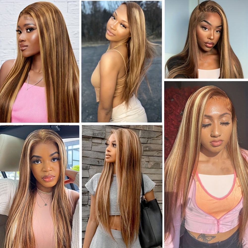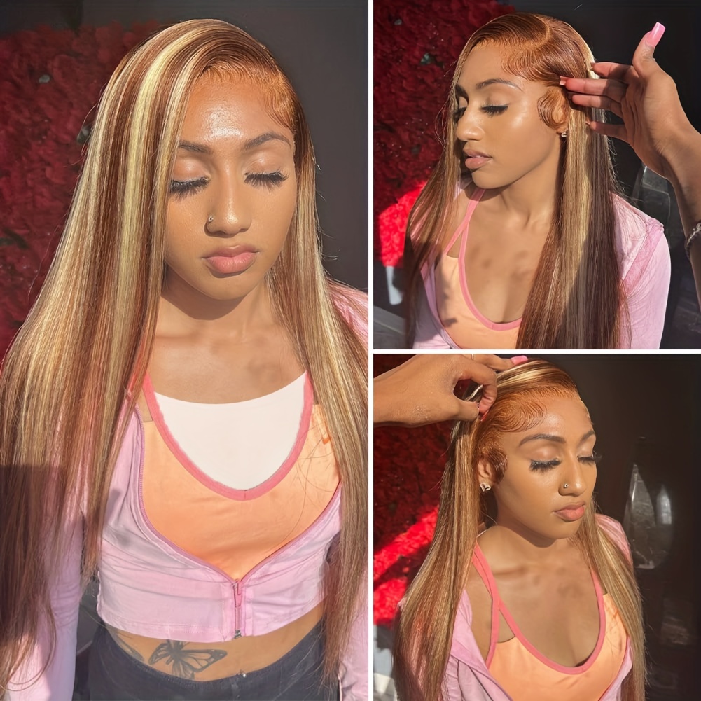 Easy-Wear Glueless Bone Straight Human Hair Wig with 13x4 HD Lace Closure - Pre-Plucked & Cut, Highlight Ombre Colors, 180% Density, Ready to Go for Women of All Ethnicities, Short Hair Wig