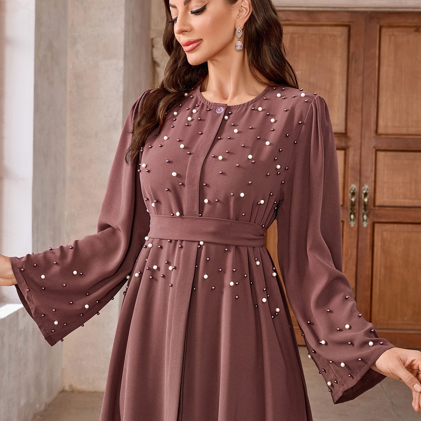 Elegant Navy Blue Abaya with Pearl Embellishments and Belt - Long Sleeve, Floor-Length Dress for Women, Perfect for Formal Occasions, Formal Attire|Elegant Abaya|Pearl Embellishments