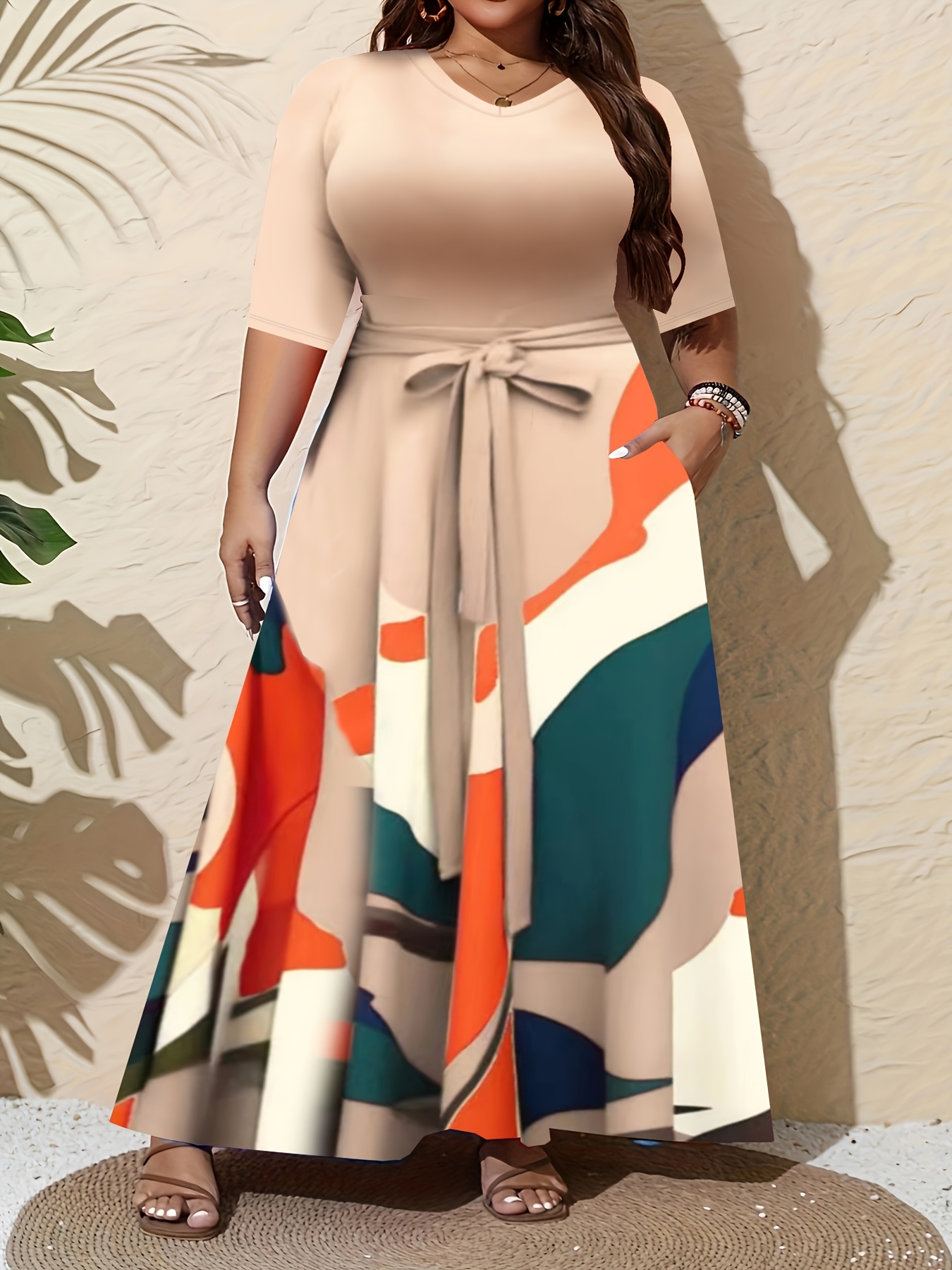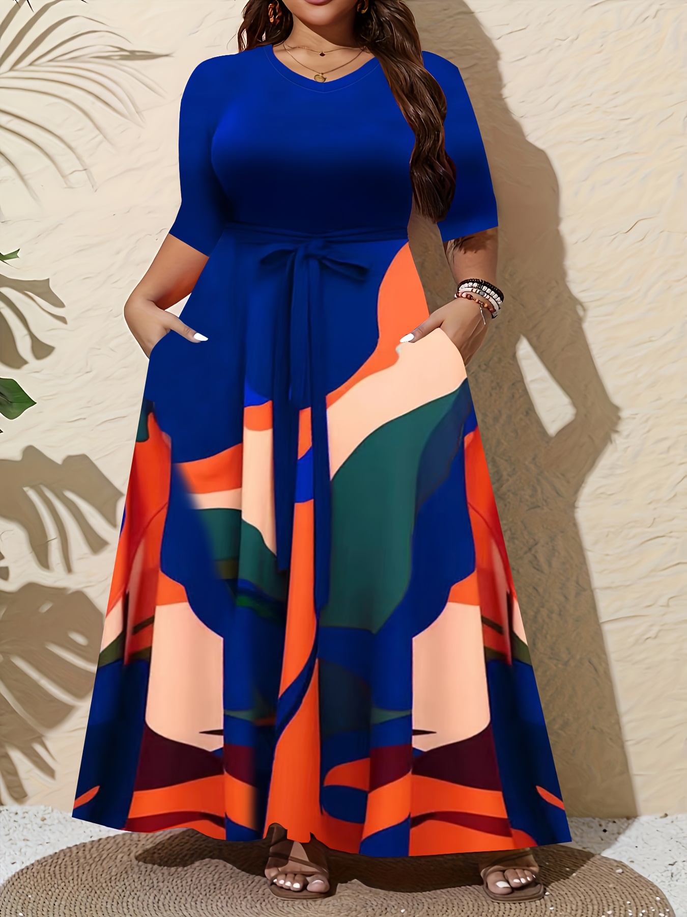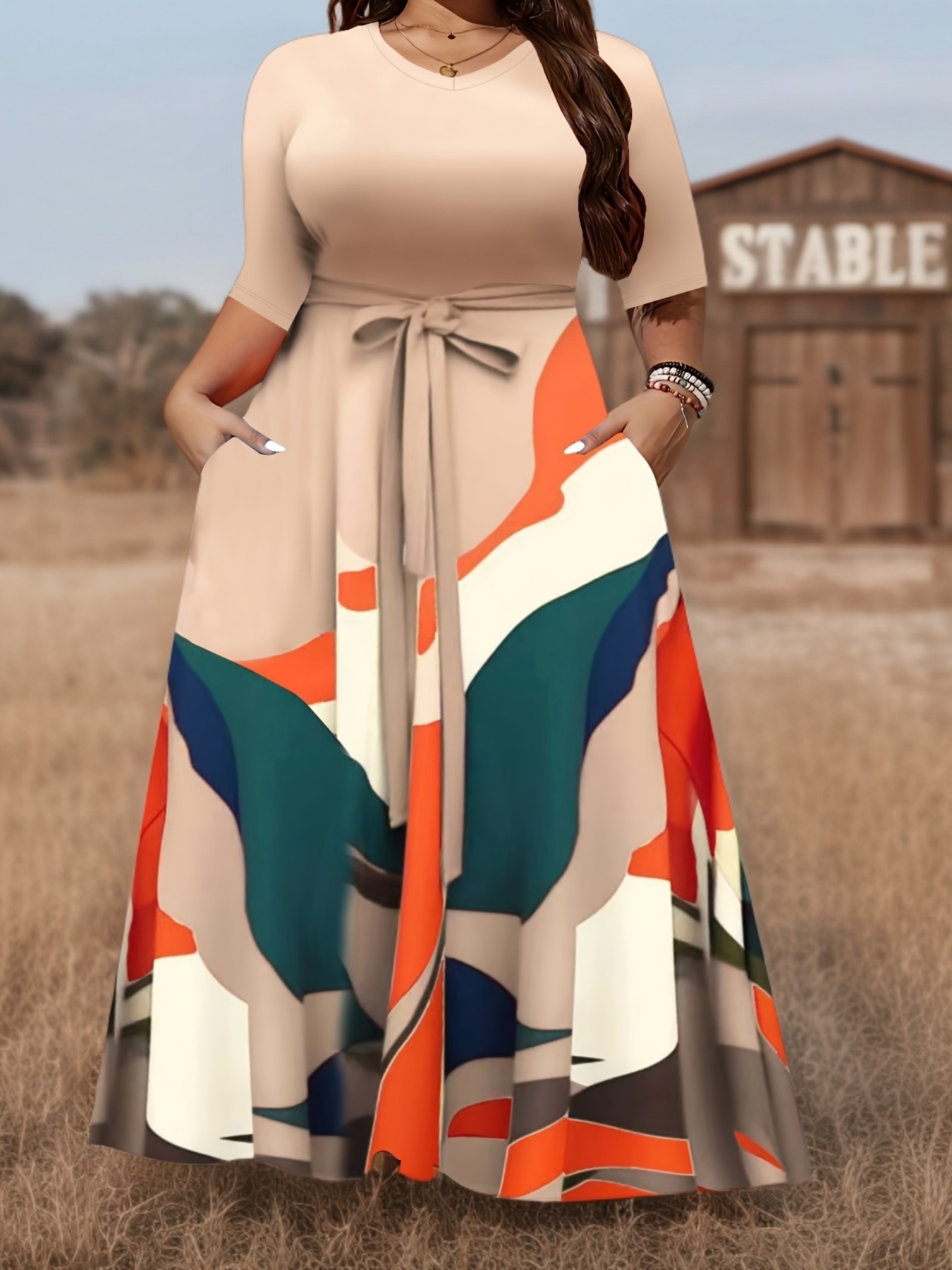 Plus Size Women'S Elegant V-Neck Dress with Contrast Print, 3/4 Sleeve Long Tunic Dress with Pockets and Adjustable Waist Belt - Perfect for Casual Outings, Spring/Summer/Fall, Casual Outing Attire|Vibrant Print Dress|Pockets