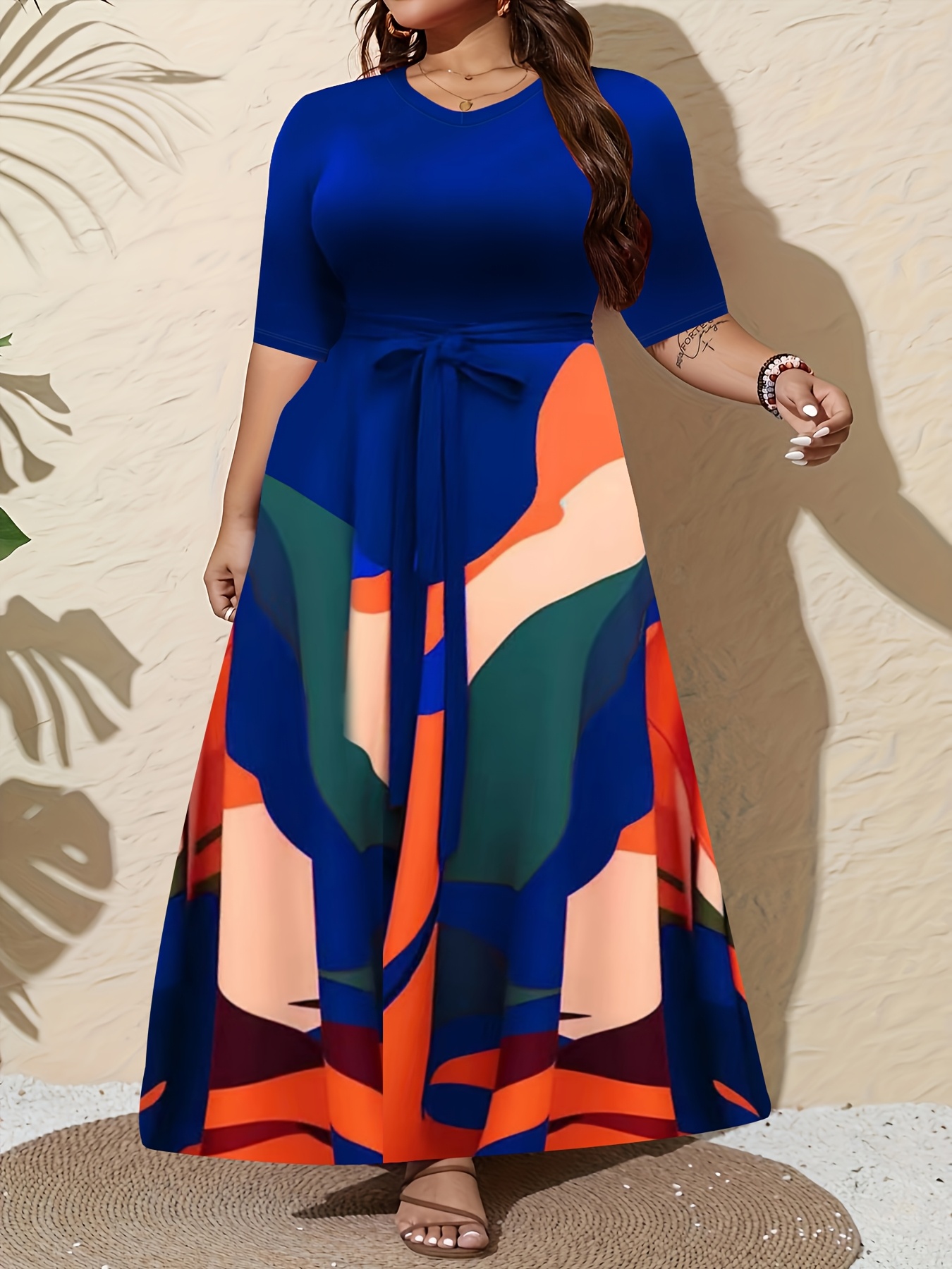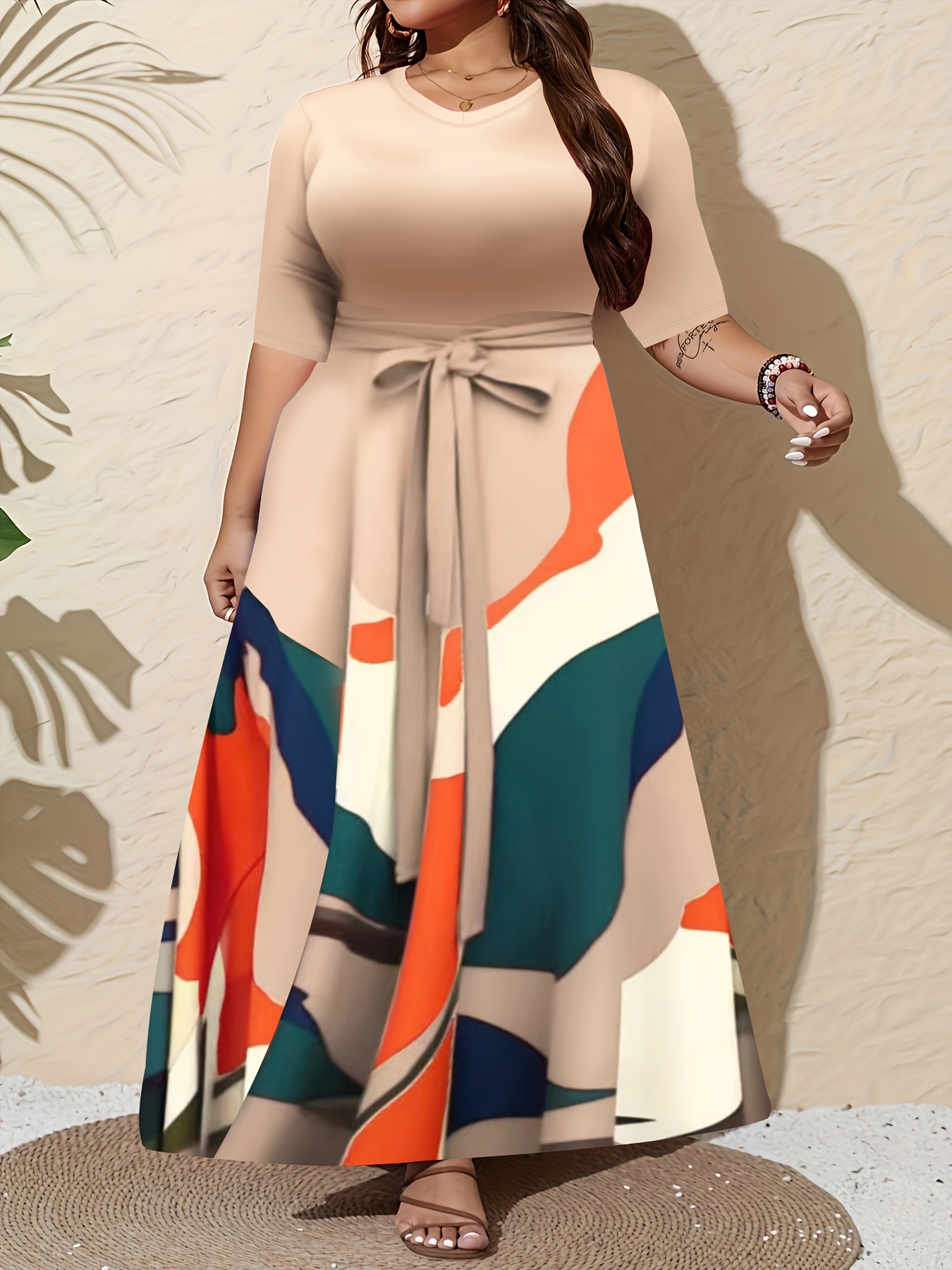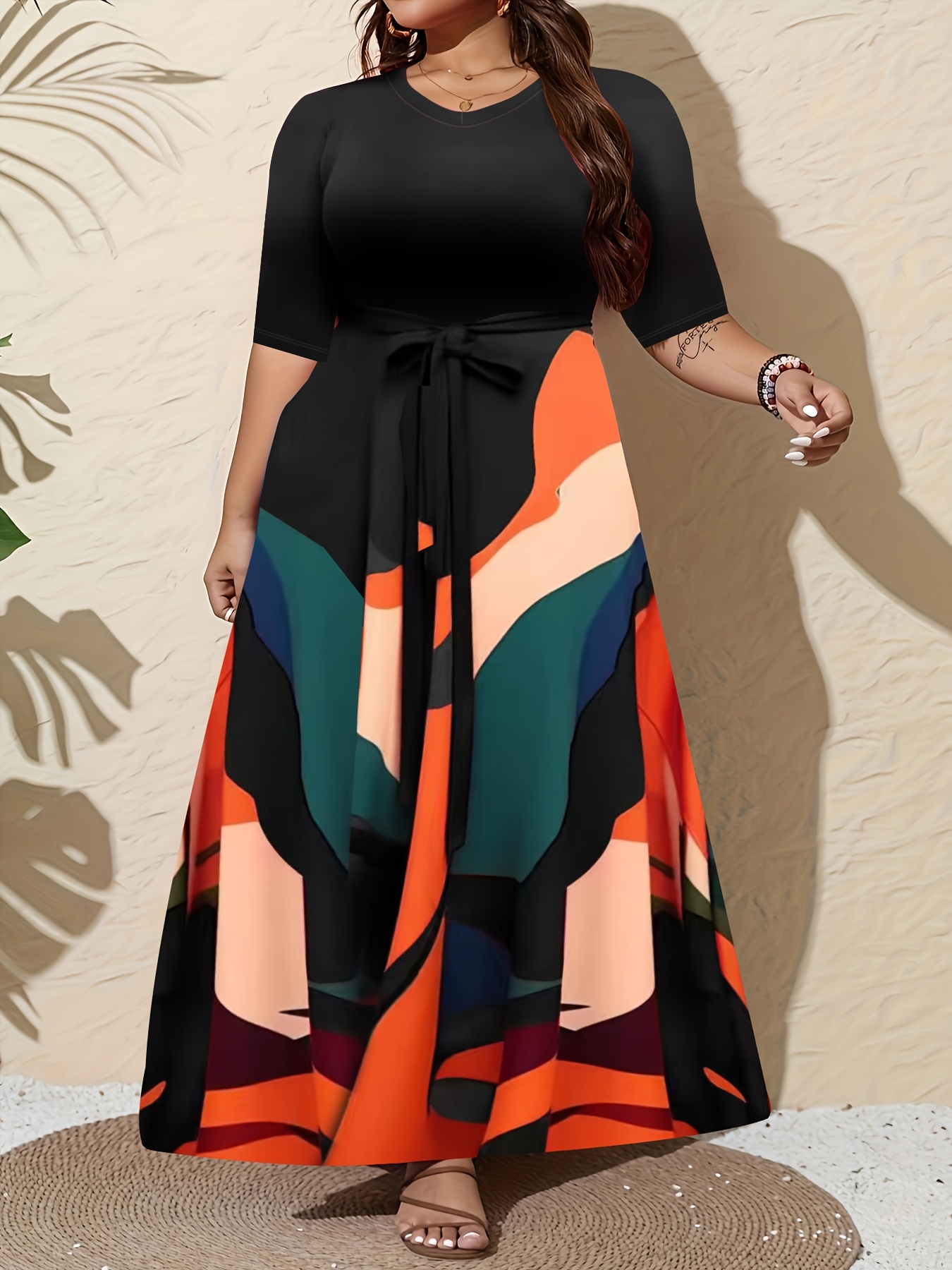 Plus Size Women'S Elegant V-Neck Dress with Contrast Print, 3/4 Sleeve Long Tunic Dress with Pockets and Adjustable Waist Belt - Perfect for Casual Outings, Spring/Summer/Fall, Casual Outing Attire|Vibrant Print Dress|Pockets